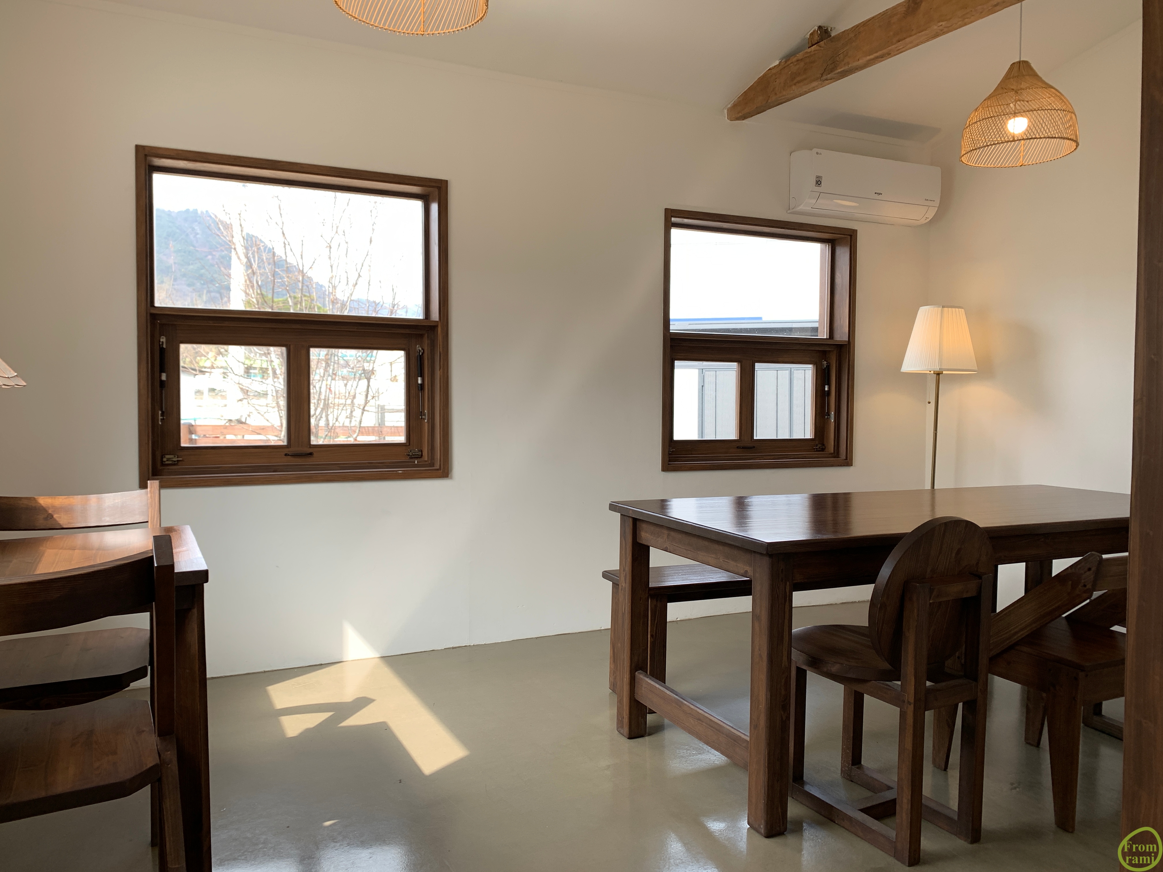 처음 오는 곳이기에 어디에 앉을까 고민 고민. 사실 네모난 큰 창문이 있는 곳에 앉고 싶었는데요~ 이미 명당자리에 자리는 사람이 있어 이 곳 저곳을 둘러보며 찍어보았어요. 좋아하는 라면 조명과 나무 테이블, 창문도 나무로 되어 있으니 더 감성 가득하네요~!