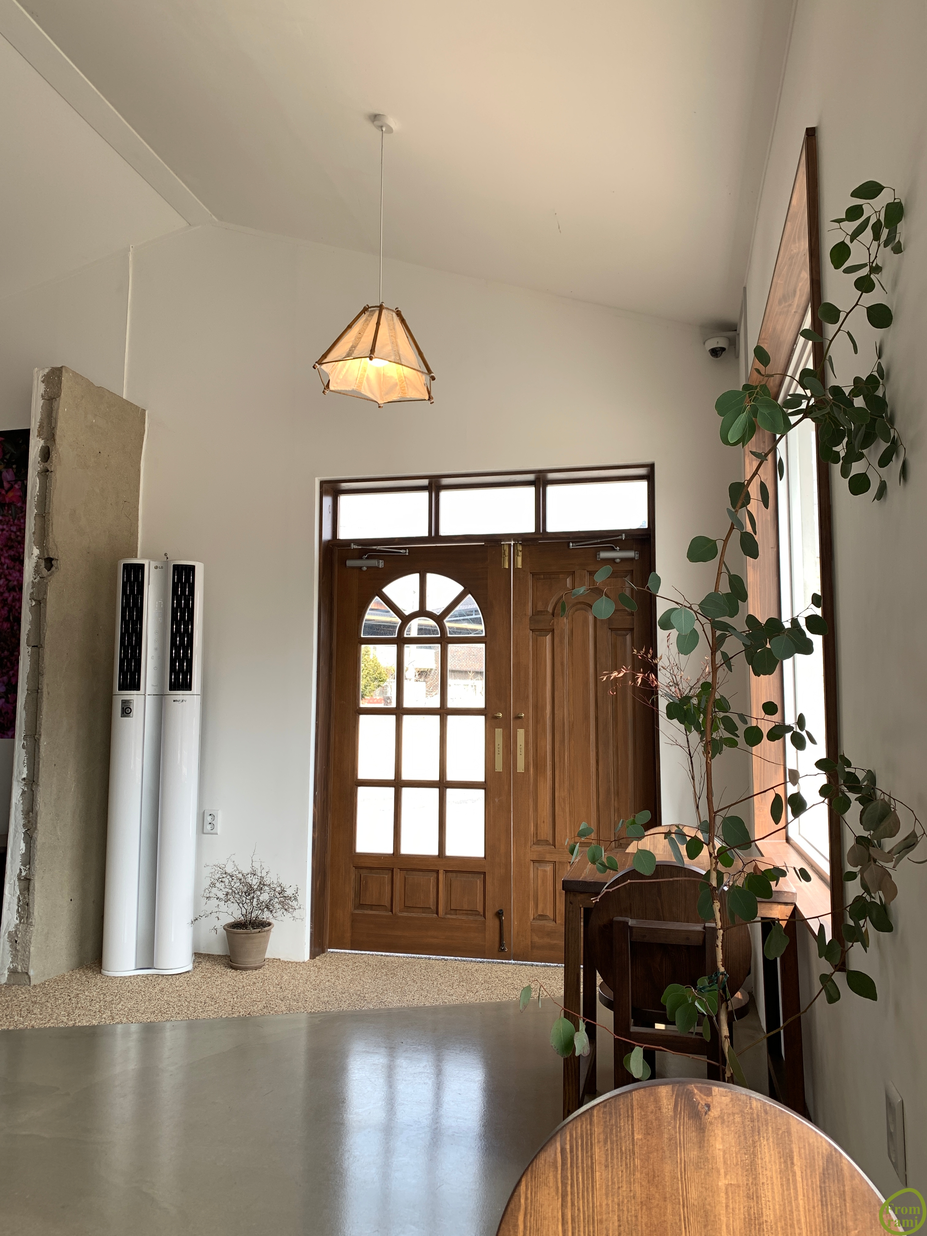 넓지 않은 공간이지만 흰벽과 높은 층고, 나무로 통일감을 주어서인지 깔끔하고 넓어 보이더라고요. 선인장과 화분들이 잘 자라고 있네요~!! 해가 이곳저곳에서 잘 들어서 꽃도 활짝 피었나 봅니다.