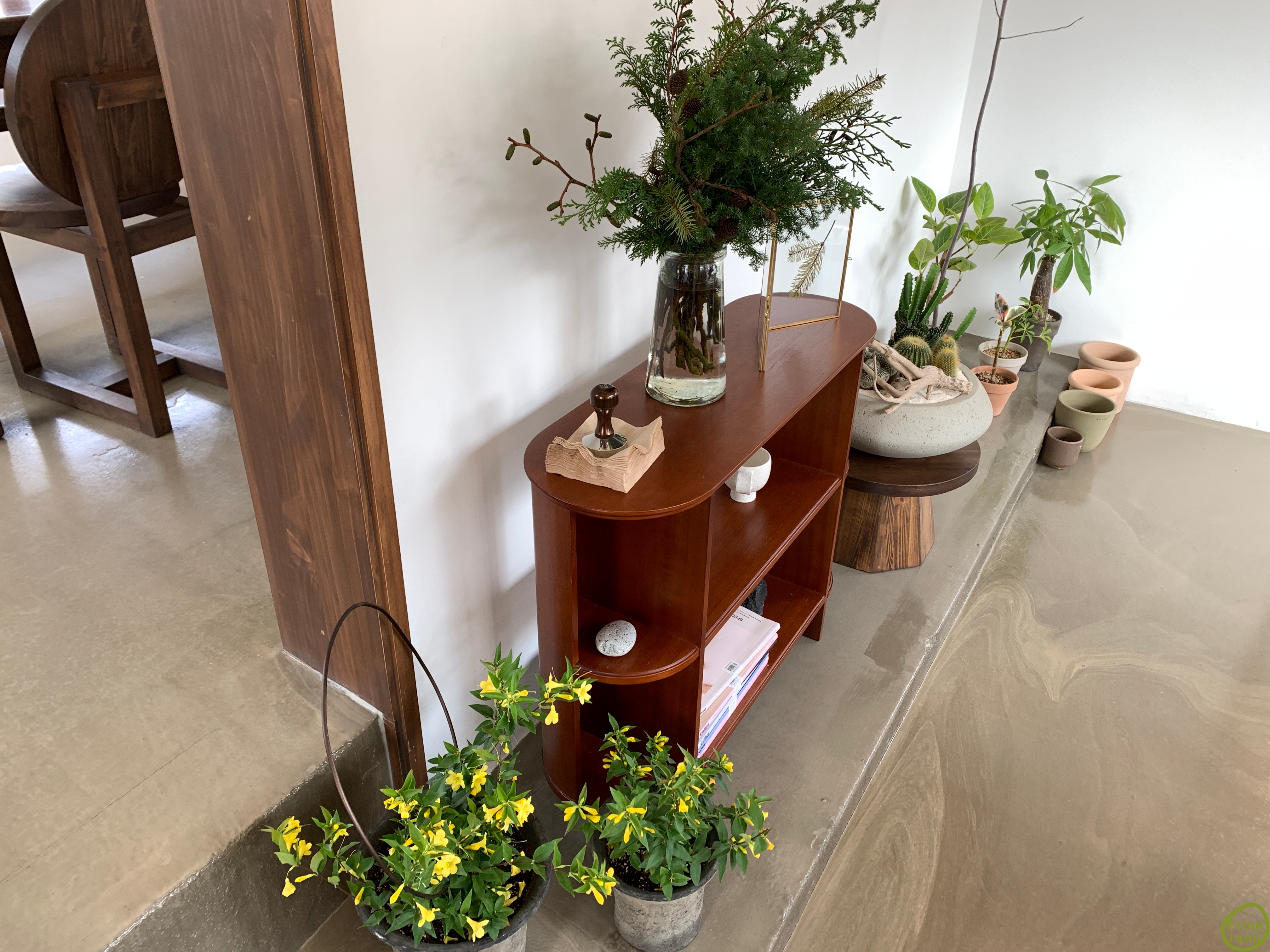 넓지 않은 공간이지만 흰벽과 높은 층고, 나무로 통일감을 주어서인지 깔끔하고 넓어 보이더라고요. 선인장과 화분들이 잘 자라고 있네요~!! 해가 이곳저곳에서 잘 들어서 꽃도 활짝 피었나 봅니다.