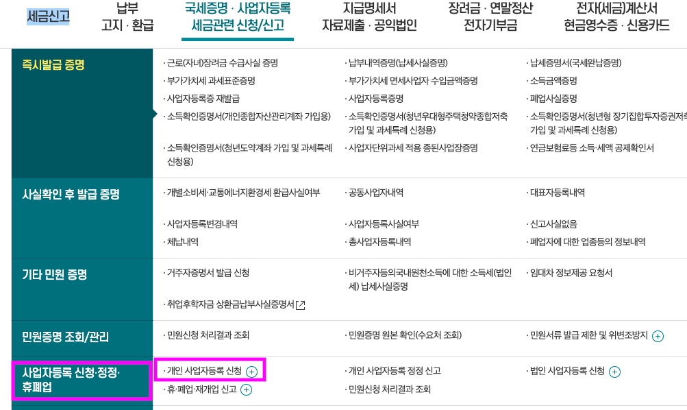 3. 국세증명 · 사업자등록 세금관련 신청/신고 → 사업자등록 신청 · 정정 · 휴폐업 → 개인 사업자등록 신청