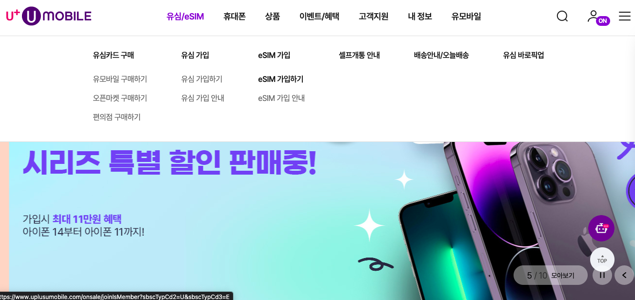 2. 가입 후 로그인 후 유심/eSIM 버튼 → eSIM 가입하기