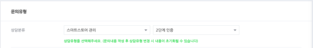 - 상담분류 :  스마트스토어 관리 → 2단계 인증