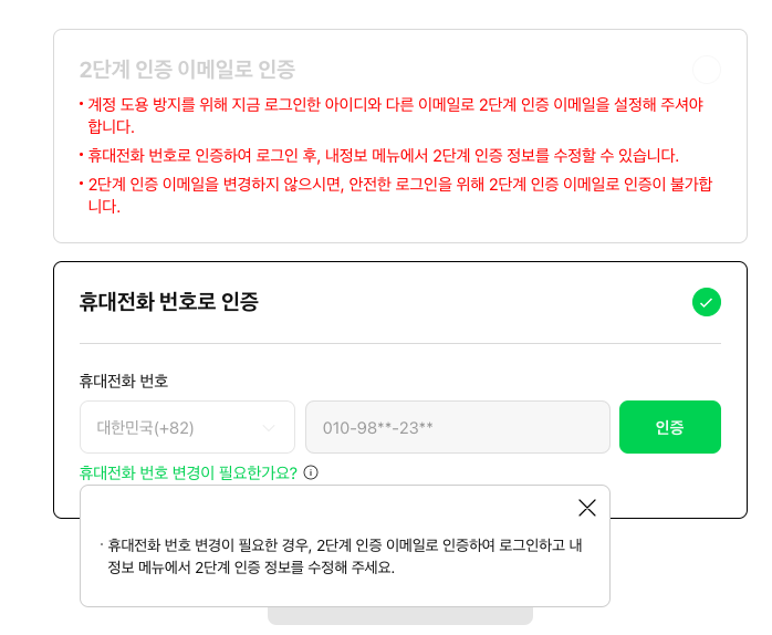 아이러니하게 휴대전화 변경이 필요한 경우, 2단계 인증 이메일로 인증하여 인증번호 수정 안내?!
